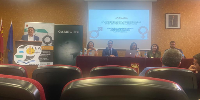 Jornada de Aplicación de los Planes de Igualdad en el sector agroalimentario, celebrada el jueves 15 de junio, de forma online y presencial en las instalaciones del Centro Integral de Formación y Experiencias Agrarias de Molina de Segura, con el fin de informar a empresarios y trabajadores del sector, responsables de recursos humanos, relaciones laborales, prevención de riesgos, formación, comunicación y Responsabilidad Social Corporativa sobre las obligaciones inmediatas que tienen las empresas en materia de igualdad.